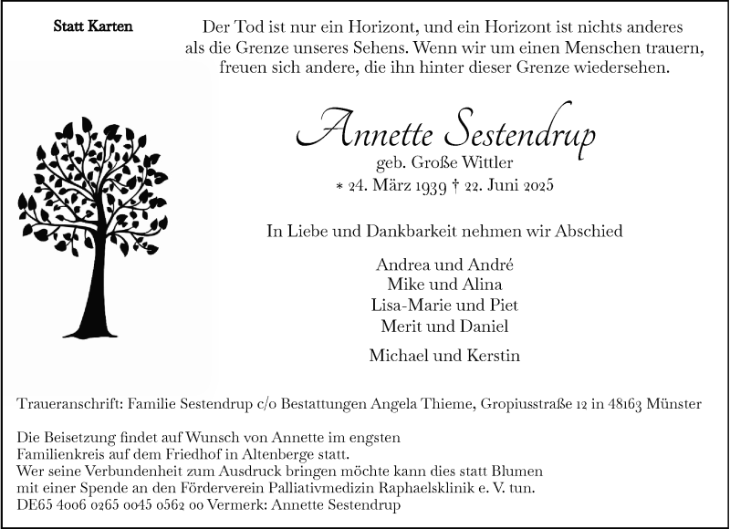 Hier finden Sie alle Traueranzeigen aus der Zeitung, die bisher für Annette Sestendrup erschienen sind. Weitere Traueranzeigen, die in der Zeitung erscheinen, werden hier ebenfalls aufgelistet