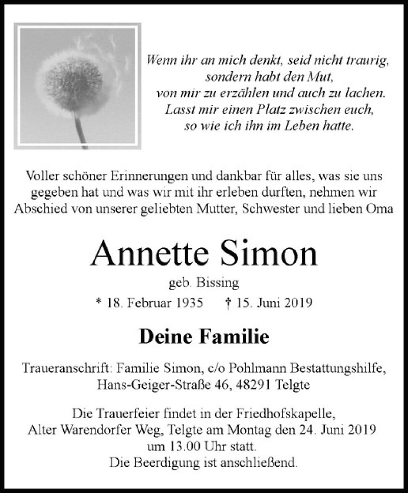 Hier finden Sie alle Traueranzeigen aus der Zeitung, die bisher für Annette Simon erschienen sind. Weitere Traueranzeigen, die in der Zeitung erscheinen, werden hier ebenfalls aufgelistet