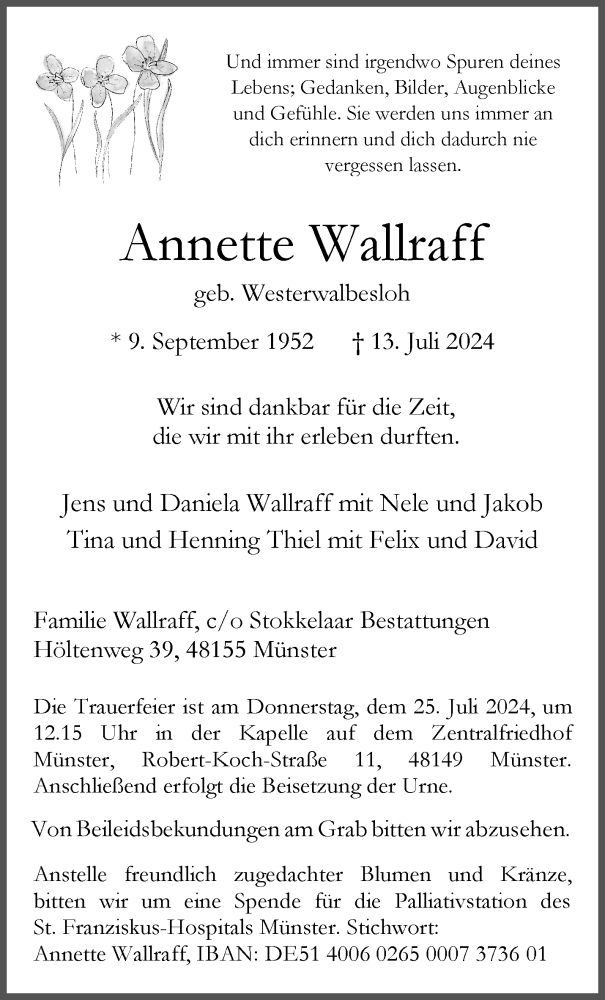 Hier finden Sie alle Traueranzeigen aus der Zeitung, die bisher für Annette Wallraff erschienen sind. Weitere Traueranzeigen, die in der Zeitung erscheinen, werden hier ebenfalls aufgelistet