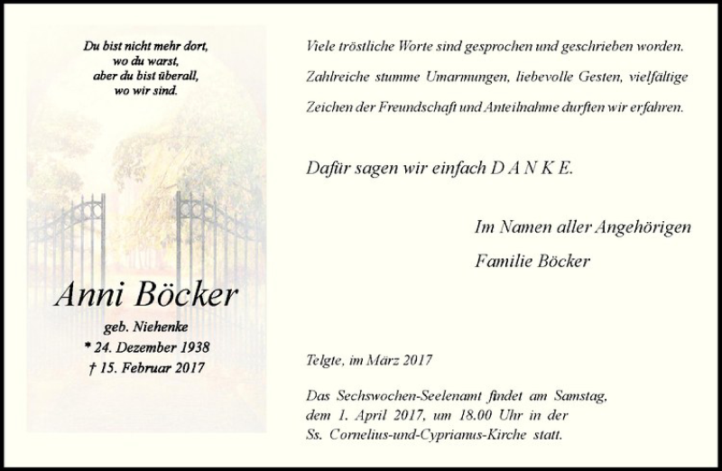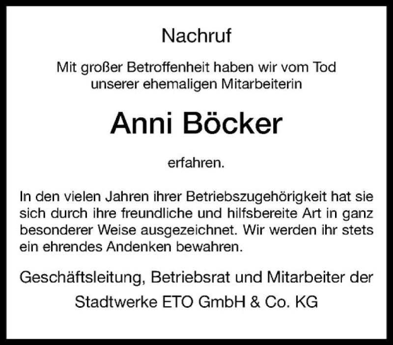 Hier finden Sie alle Traueranzeigen aus der Zeitung, die bisher für Anni Böcker erschienen sind. Weitere Traueranzeigen, die in der Zeitung erscheinen, werden hier ebenfalls aufgelistet