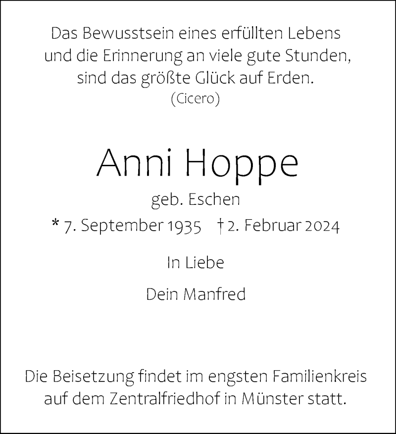 Hier finden Sie alle Traueranzeigen aus der Zeitung, die bisher für Anni Hoppe erschienen sind. Weitere Traueranzeigen, die in der Zeitung erscheinen, werden hier ebenfalls aufgelistet