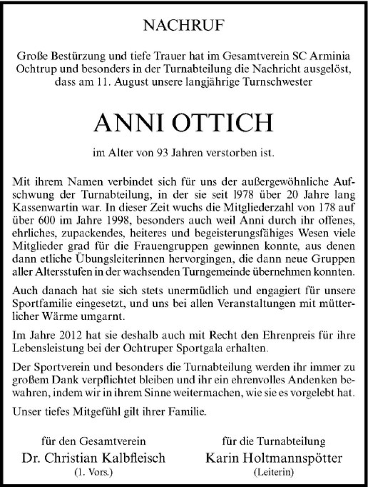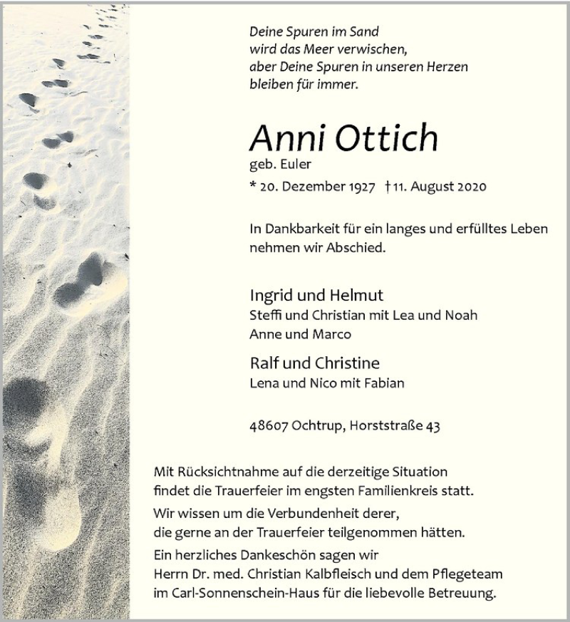 Hier finden Sie alle Traueranzeigen aus der Zeitung, die bisher für Anni Ottich erschienen sind. Weitere Traueranzeigen, die in der Zeitung erscheinen, werden hier ebenfalls aufgelistet