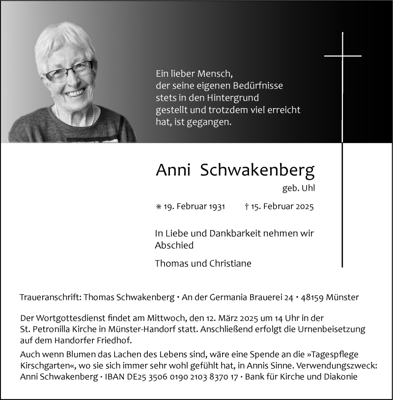 Hier finden Sie alle Traueranzeigen aus der Zeitung, die bisher für Anni Schwakenberg erschienen sind. Weitere Traueranzeigen, die in der Zeitung erscheinen, werden hier ebenfalls aufgelistet