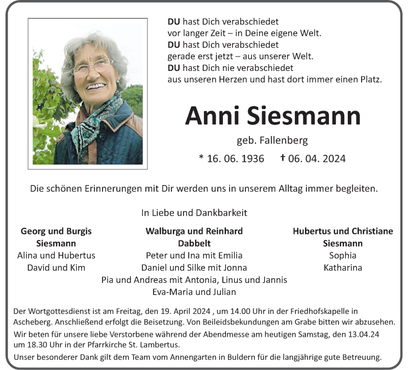 Hier finden Sie alle Traueranzeigen aus der Zeitung, die bisher für Anni Siesmann erschienen sind. Weitere Traueranzeigen, die in der Zeitung erscheinen, werden hier ebenfalls aufgelistet