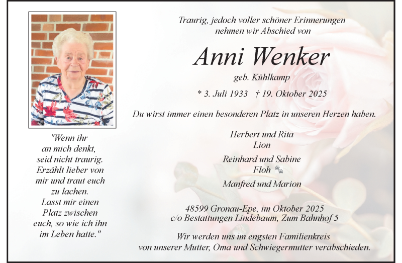 Hier finden Sie alle Traueranzeigen aus der Zeitung, die bisher für Anni Wenker erschienen sind. Weitere Traueranzeigen, die in der Zeitung erscheinen, werden hier ebenfalls aufgelistet