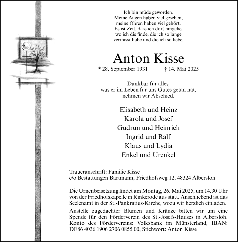 Hier finden Sie alle Traueranzeigen aus der Zeitung, die bisher für Anton Kisse erschienen sind. Weitere Traueranzeigen, die in der Zeitung erscheinen, werden hier ebenfalls aufgelistet