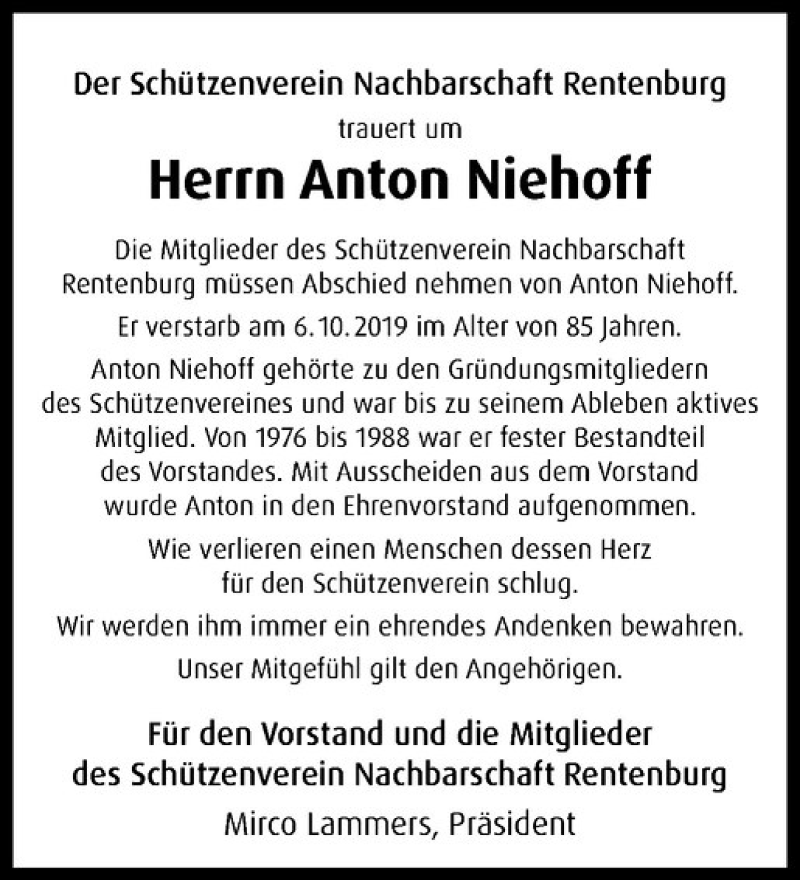 Hier finden Sie alle Traueranzeigen aus der Zeitung, die bisher für Anton Niehoff erschienen sind. Weitere Traueranzeigen, die in der Zeitung erscheinen, werden hier ebenfalls aufgelistet