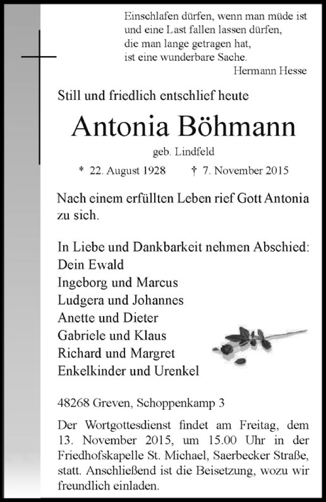 Hier finden Sie alle Traueranzeigen aus der Zeitung, die bisher für Antonia Böhmann erschienen sind. Weitere Traueranzeigen, die in der Zeitung erscheinen, werden hier ebenfalls aufgelistet