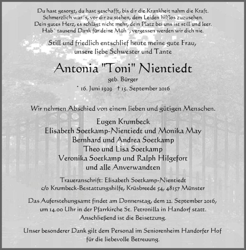 Hier finden Sie alle Traueranzeigen aus der Zeitung, die bisher für Antonia Nientiedt erschienen sind. Weitere Traueranzeigen, die in der Zeitung erscheinen, werden hier ebenfalls aufgelistet
