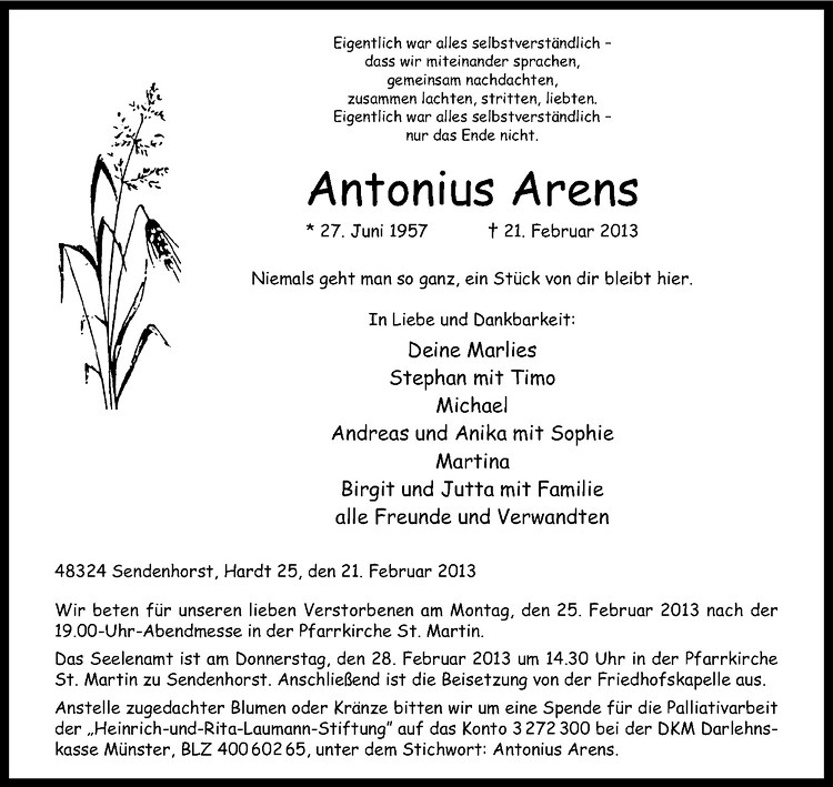 Hier finden Sie alle Traueranzeigen aus der Zeitung, die bisher für Antonius Arens erschienen sind. Weitere Traueranzeigen, die in der Zeitung erscheinen, werden hier ebenfalls aufgelistet