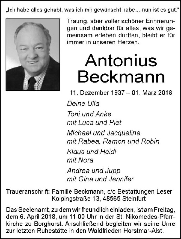 Hier finden Sie alle Traueranzeigen aus der Zeitung, die bisher für Antonius Beckmann erschienen sind. Weitere Traueranzeigen, die in der Zeitung erscheinen, werden hier ebenfalls aufgelistet