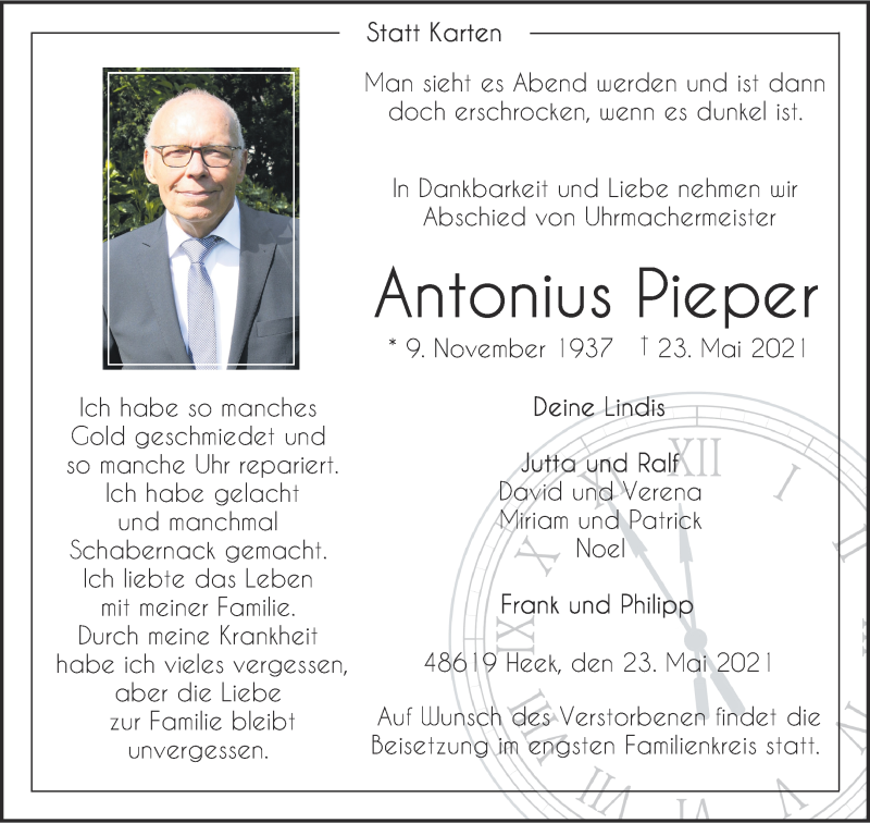 Hier finden Sie alle Traueranzeigen aus der Zeitung, die bisher für Antonius Pieper erschienen sind. Weitere Traueranzeigen, die in der Zeitung erscheinen, werden hier ebenfalls aufgelistet