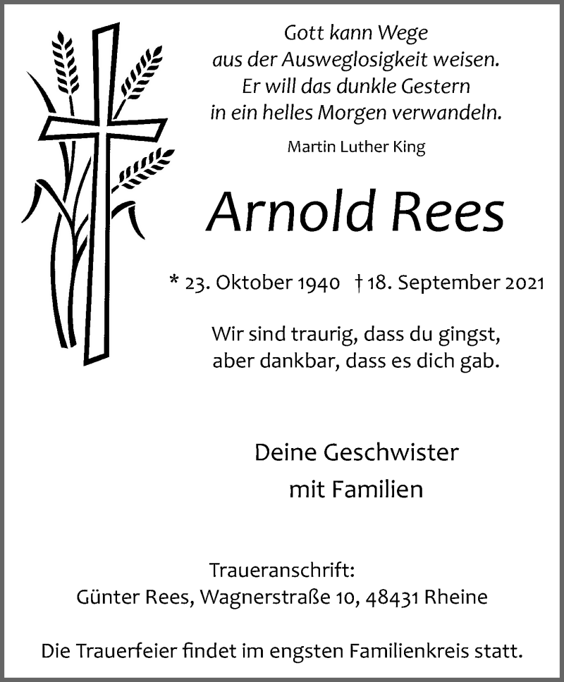 Hier finden Sie alle Traueranzeigen aus der Zeitung, die bisher für Arnold Rees erschienen sind. Weitere Traueranzeigen, die in der Zeitung erscheinen, werden hier ebenfalls aufgelistet