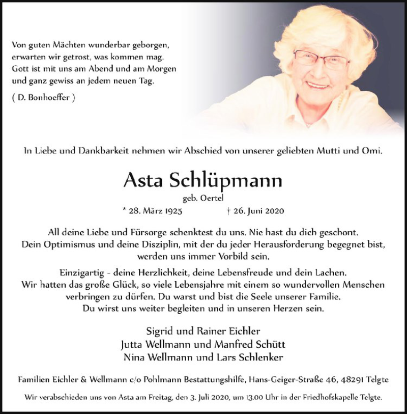 Hier finden Sie alle Traueranzeigen aus der Zeitung, die bisher für Asta Schlüpmann erschienen sind. Weitere Traueranzeigen, die in der Zeitung erscheinen, werden hier ebenfalls aufgelistet