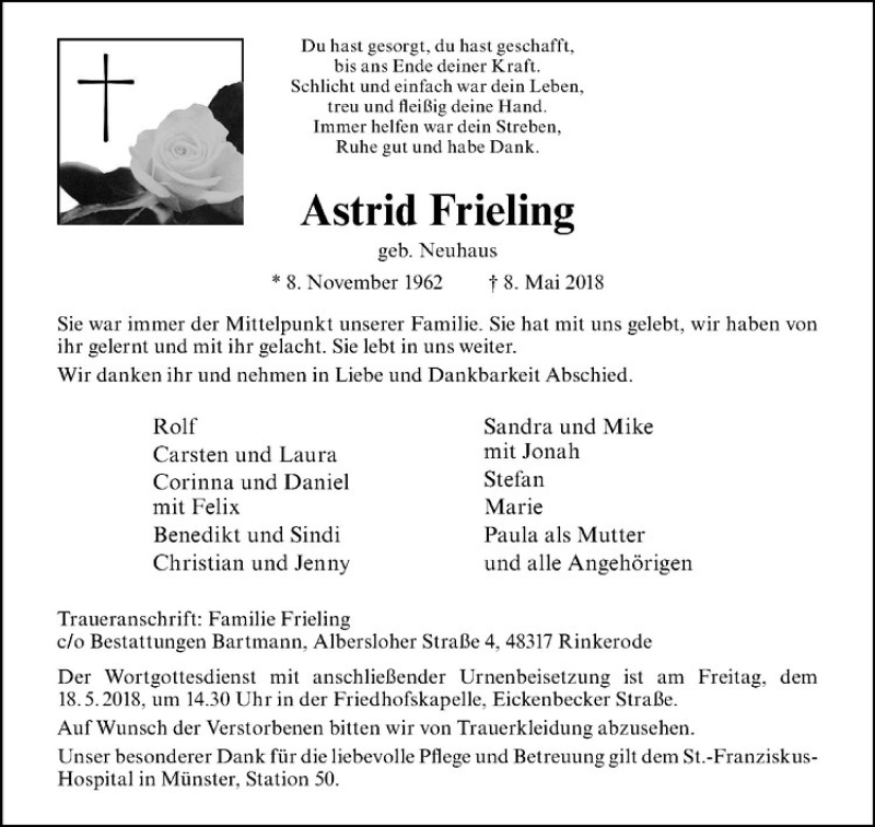 Hier finden Sie alle Traueranzeigen aus der Zeitung, die bisher für Astrid Frieling erschienen sind. Weitere Traueranzeigen, die in der Zeitung erscheinen, werden hier ebenfalls aufgelistet