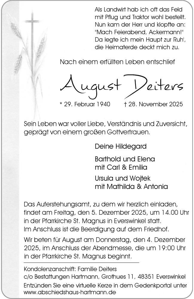 Hier finden Sie alle Traueranzeigen aus der Zeitung, die bisher für August Deiters erschienen sind. Weitere Traueranzeigen, die in der Zeitung erscheinen, werden hier ebenfalls aufgelistet