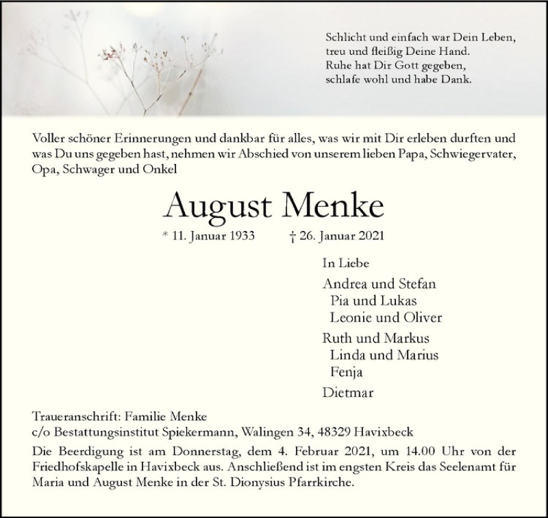 Hier finden Sie alle Traueranzeigen aus der Zeitung, die bisher für August Menke erschienen sind. Weitere Traueranzeigen, die in der Zeitung erscheinen, werden hier ebenfalls aufgelistet