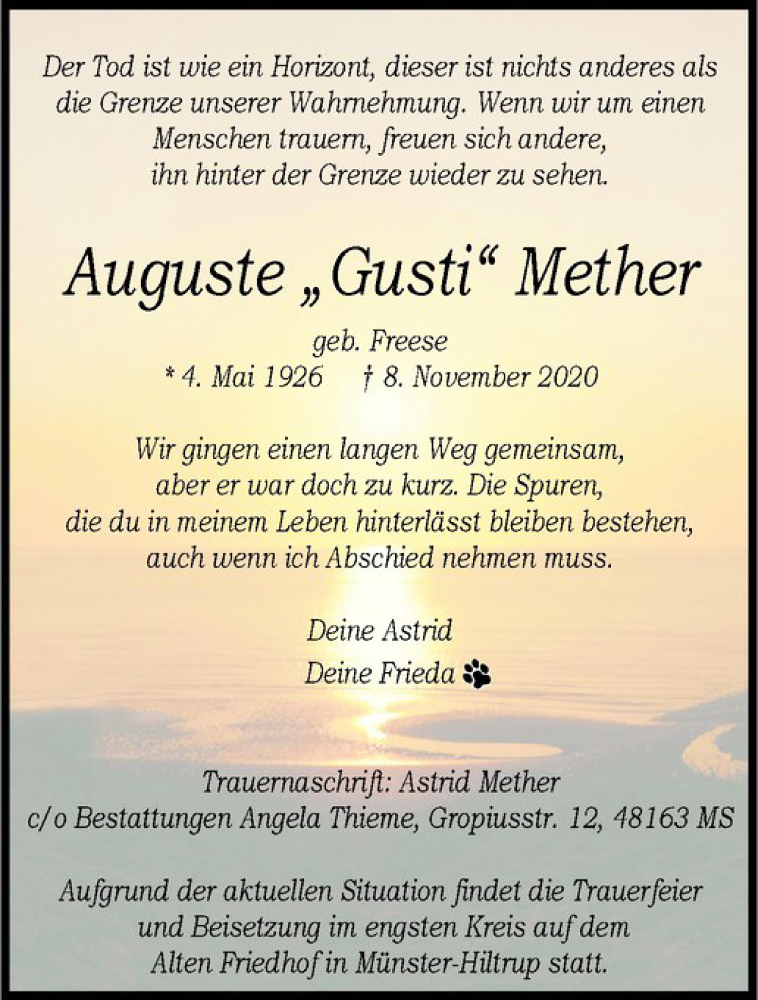 Hier finden Sie alle Traueranzeigen aus der Zeitung, die bisher für Auguste Mether erschienen sind. Weitere Traueranzeigen, die in der Zeitung erscheinen, werden hier ebenfalls aufgelistet