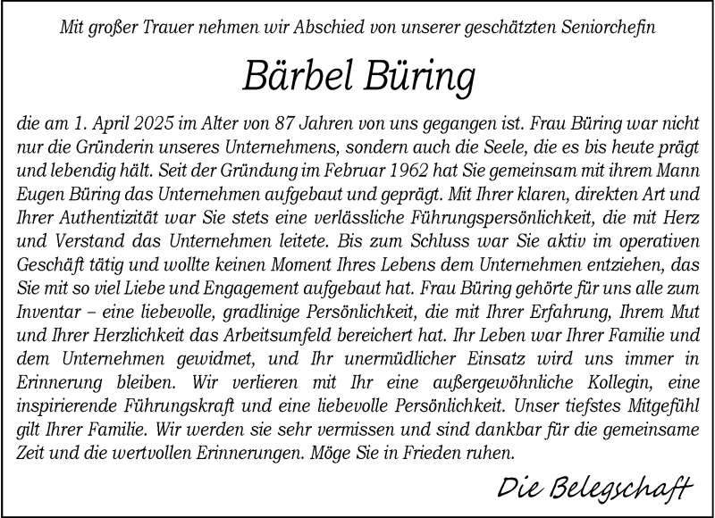 Hier finden Sie alle Traueranzeigen aus der Zeitung, die bisher für Bärbel Büring erschienen sind. Weitere Traueranzeigen, die in der Zeitung erscheinen, werden hier ebenfalls aufgelistet
