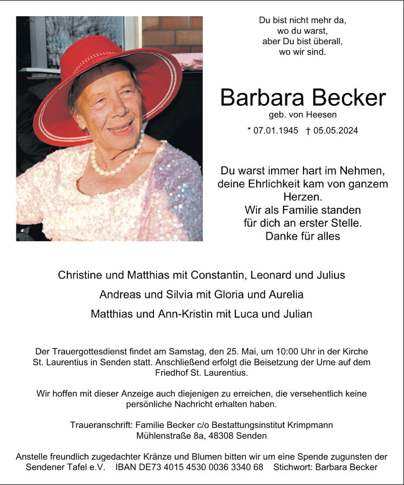 Hier finden Sie alle Traueranzeigen aus der Zeitung, die bisher für Barbara Becker erschienen sind. Weitere Traueranzeigen, die in der Zeitung erscheinen, werden hier ebenfalls aufgelistet