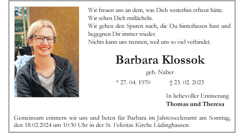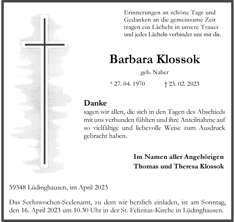 Hier finden Sie alle Traueranzeigen aus der Zeitung, die bisher für Barbara Klossok erschienen sind. Weitere Traueranzeigen, die in der Zeitung erscheinen, werden hier ebenfalls aufgelistet