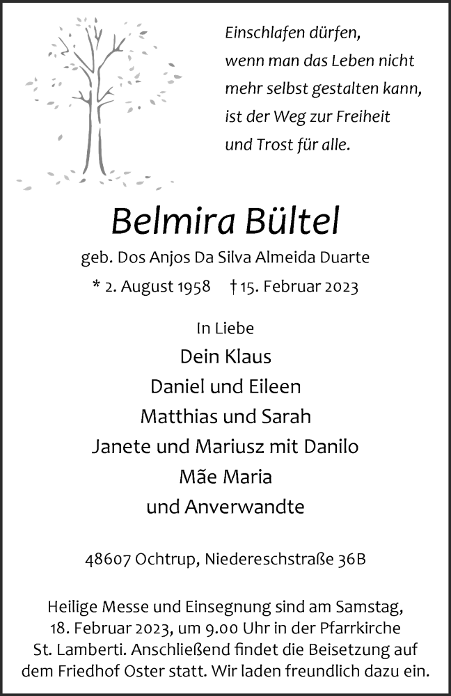 Hier finden Sie alle Traueranzeigen aus der Zeitung, die bisher für Belmira Bültel erschienen sind. Weitere Traueranzeigen, die in der Zeitung erscheinen, werden hier ebenfalls aufgelistet