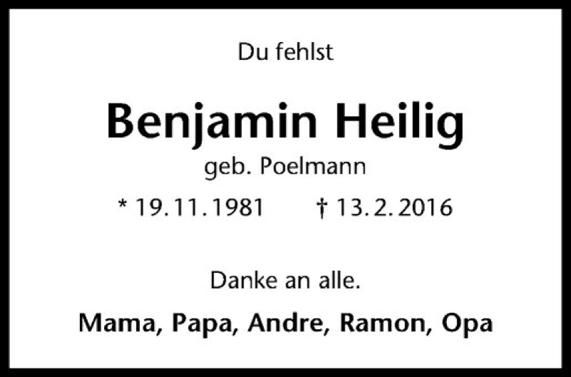 Hier finden Sie alle Traueranzeigen aus der Zeitung, die bisher für Benjamin Heilig erschienen sind. Weitere Traueranzeigen, die in der Zeitung erscheinen, werden hier ebenfalls aufgelistet