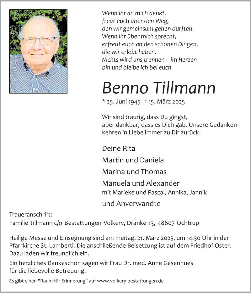 Hier finden Sie alle Traueranzeigen aus der Zeitung, die bisher für Benno Tillmann erschienen sind. Weitere Traueranzeigen, die in der Zeitung erscheinen, werden hier ebenfalls aufgelistet