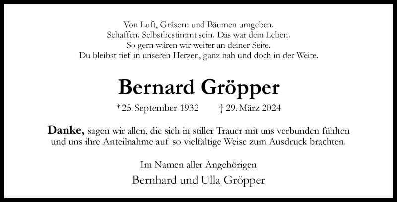 Hier finden Sie alle Traueranzeigen aus der Zeitung, die bisher für Bernard Gröpper erschienen sind. Weitere Traueranzeigen, die in der Zeitung erscheinen, werden hier ebenfalls aufgelistet
