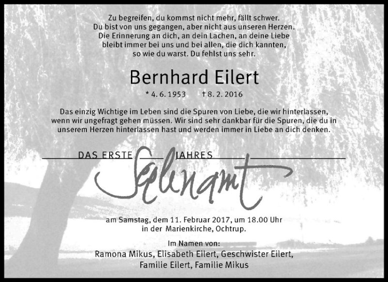 Hier finden Sie alle Traueranzeigen aus der Zeitung, die bisher für Bernd Eilert erschienen sind. Weitere Traueranzeigen, die in der Zeitung erscheinen, werden hier ebenfalls aufgelistet
