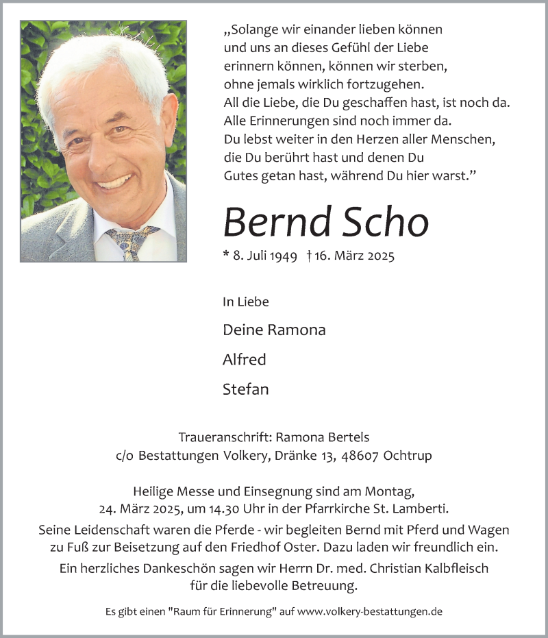 Hier finden Sie alle Traueranzeigen aus der Zeitung, die bisher für Bernd Scho erschienen sind. Weitere Traueranzeigen, die in der Zeitung erscheinen, werden hier ebenfalls aufgelistet
