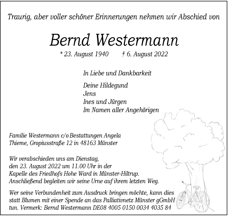 Hier finden Sie alle Traueranzeigen aus der Zeitung, die bisher für Bernd Westermann erschienen sind. Weitere Traueranzeigen, die in der Zeitung erscheinen, werden hier ebenfalls aufgelistet