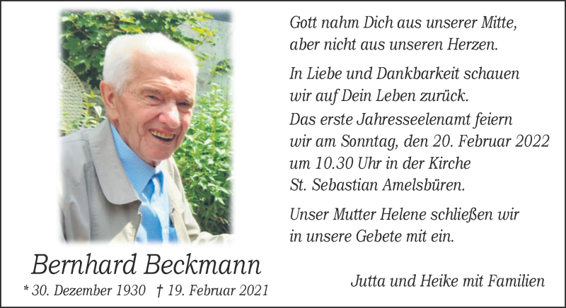 Hier finden Sie alle Traueranzeigen aus der Zeitung, die bisher für Bernhard Beckmann erschienen sind. Weitere Traueranzeigen, die in der Zeitung erscheinen, werden hier ebenfalls aufgelistet