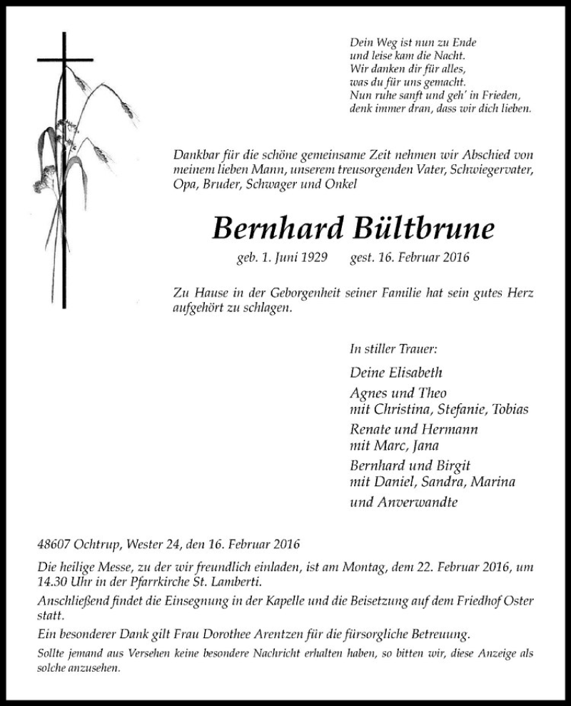 Hier finden Sie alle Traueranzeigen aus der Zeitung, die bisher für Bernhard Bültbrune erschienen sind. Weitere Traueranzeigen, die in der Zeitung erscheinen, werden hier ebenfalls aufgelistet
