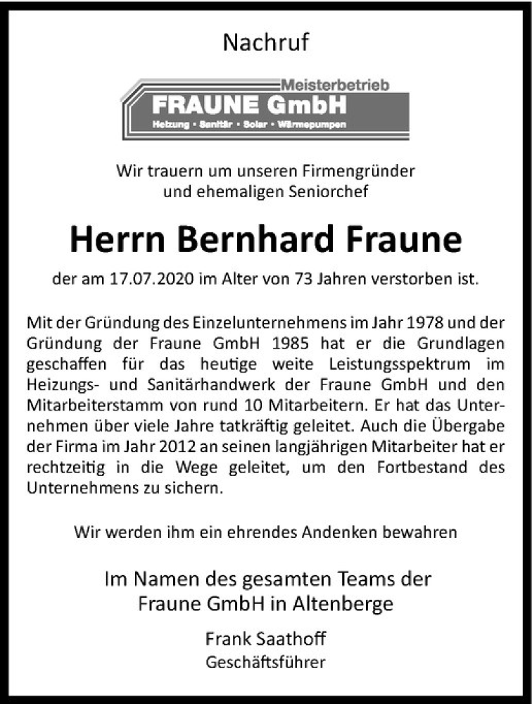 Hier finden Sie alle Traueranzeigen aus der Zeitung, die bisher für Bernhard Fraune erschienen sind. Weitere Traueranzeigen, die in der Zeitung erscheinen, werden hier ebenfalls aufgelistet