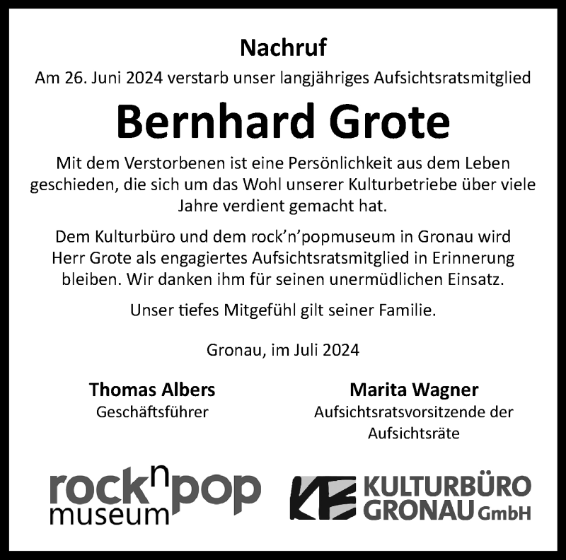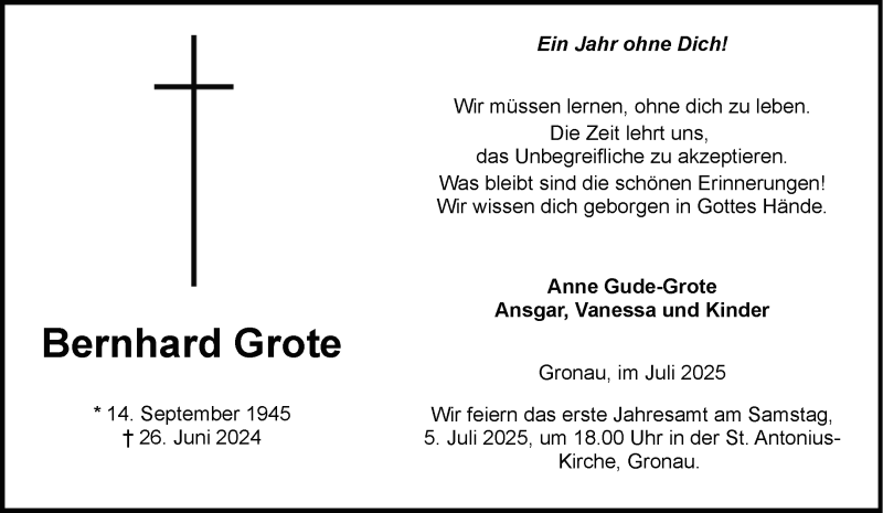 Hier finden Sie alle Traueranzeigen aus der Zeitung, die bisher für Bernhard Grote erschienen sind. Weitere Traueranzeigen, die in der Zeitung erscheinen, werden hier ebenfalls aufgelistet