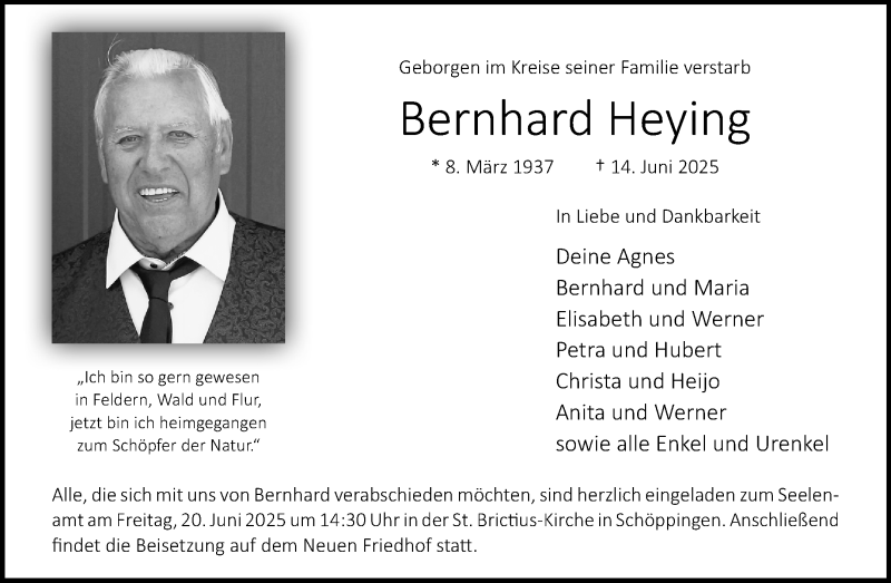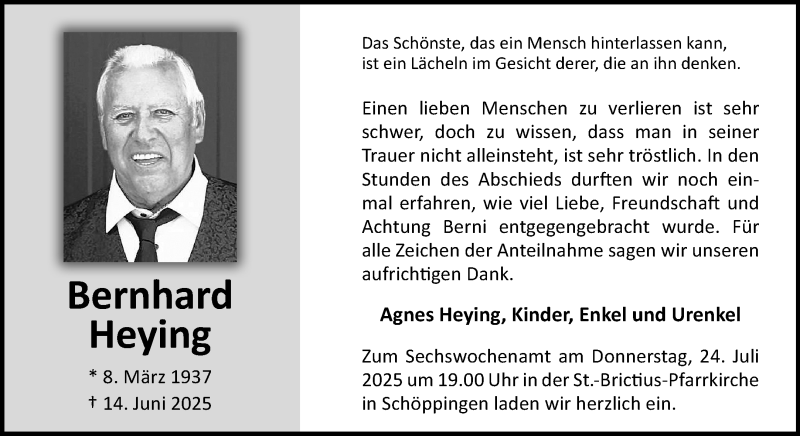 Hier finden Sie alle Traueranzeigen aus der Zeitung, die bisher für Bernhard Heying erschienen sind. Weitere Traueranzeigen, die in der Zeitung erscheinen, werden hier ebenfalls aufgelistet