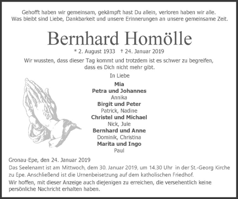 Hier finden Sie alle Traueranzeigen aus der Zeitung, die bisher für Bernhard Homölle erschienen sind. Weitere Traueranzeigen, die in der Zeitung erscheinen, werden hier ebenfalls aufgelistet