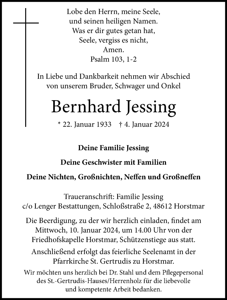Hier finden Sie alle Traueranzeigen aus der Zeitung, die bisher für Bernhard Jessing erschienen sind. Weitere Traueranzeigen, die in der Zeitung erscheinen, werden hier ebenfalls aufgelistet