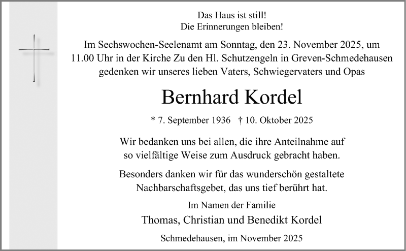 Hier finden Sie alle Traueranzeigen aus der Zeitung, die bisher für Bernhard Kordel erschienen sind. Weitere Traueranzeigen, die in der Zeitung erscheinen, werden hier ebenfalls aufgelistet