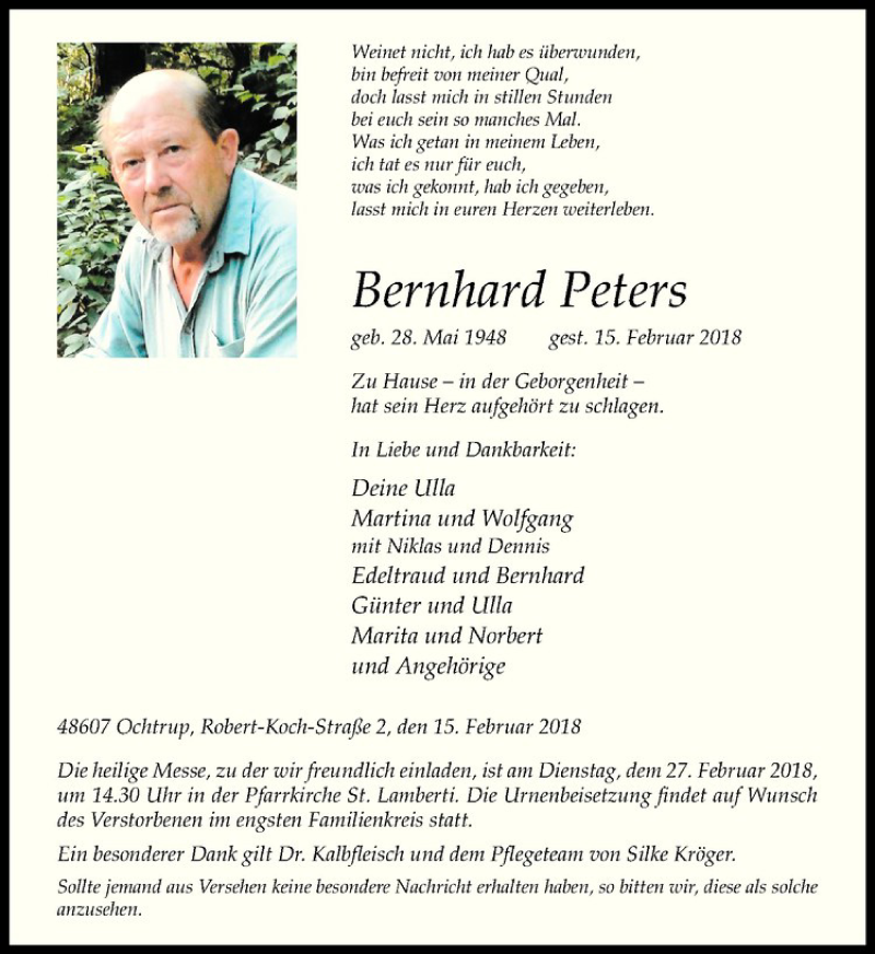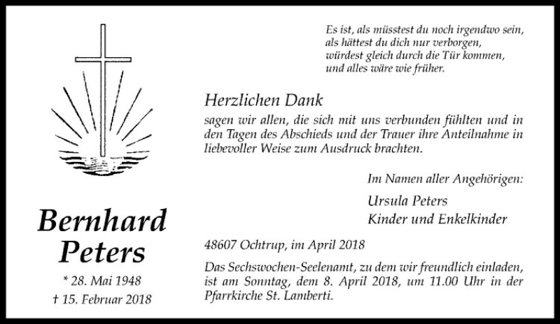 Hier finden Sie alle Traueranzeigen aus der Zeitung, die bisher für Bernhard Peters erschienen sind. Weitere Traueranzeigen, die in der Zeitung erscheinen, werden hier ebenfalls aufgelistet