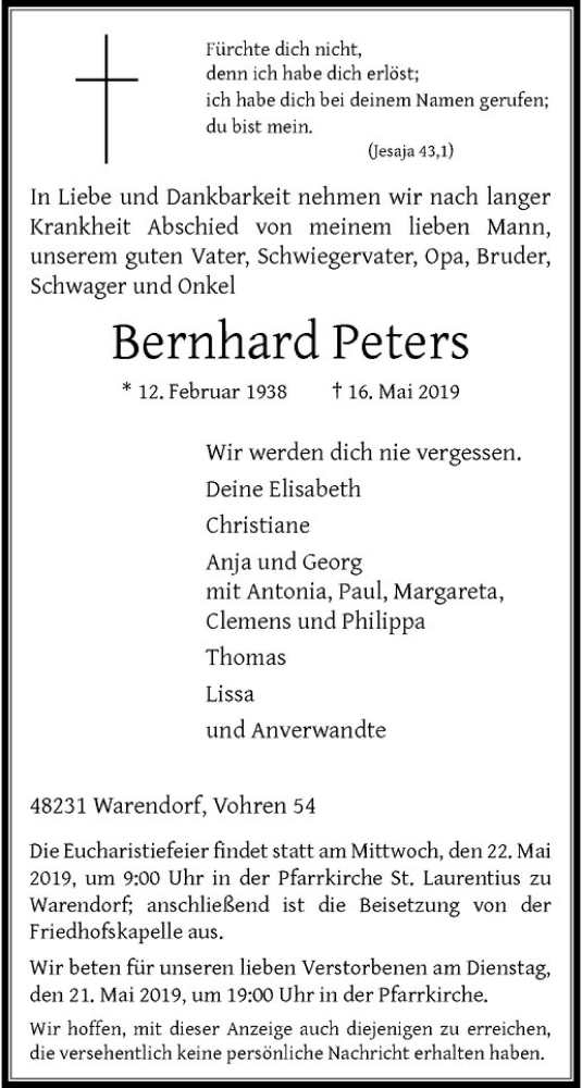 Hier finden Sie alle Traueranzeigen aus der Zeitung, die bisher für Bernhard Peters erschienen sind. Weitere Traueranzeigen, die in der Zeitung erscheinen, werden hier ebenfalls aufgelistet