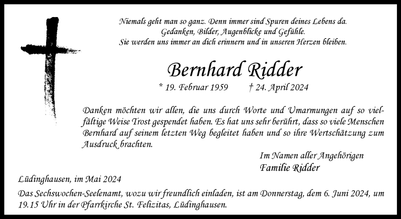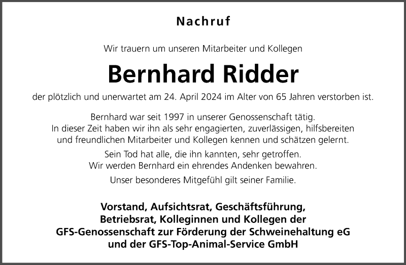 Hier finden Sie alle Traueranzeigen aus der Zeitung, die bisher für Bernhard Ridder erschienen sind. Weitere Traueranzeigen, die in der Zeitung erscheinen, werden hier ebenfalls aufgelistet