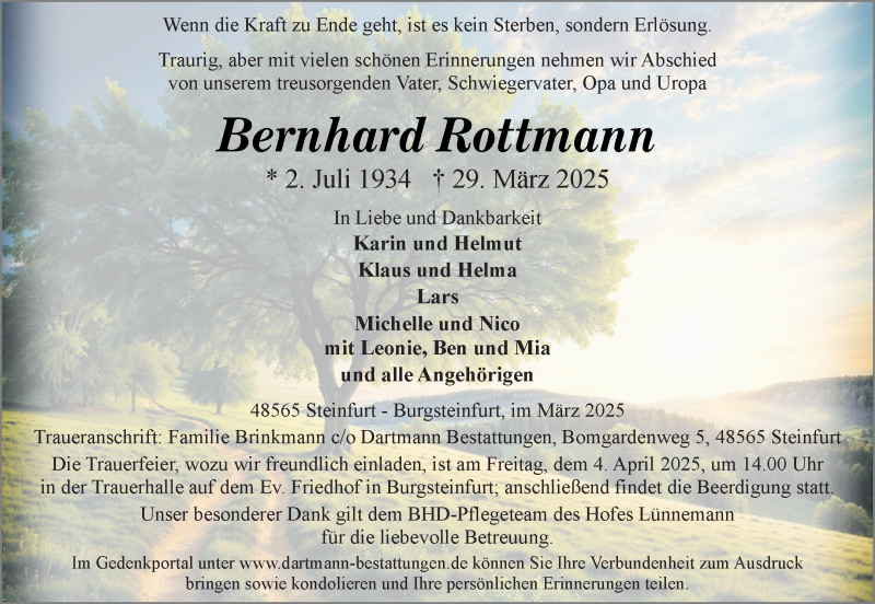 Hier finden Sie alle Traueranzeigen aus der Zeitung, die bisher für Bernhard Rottmann erschienen sind. Weitere Traueranzeigen, die in der Zeitung erscheinen, werden hier ebenfalls aufgelistet