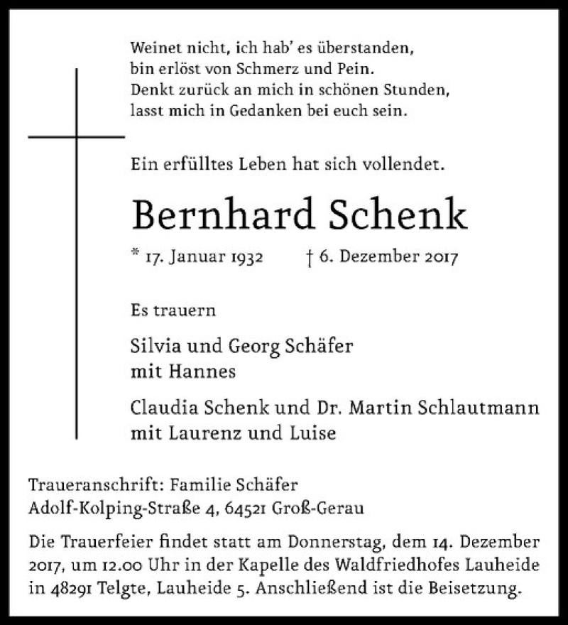 Hier finden Sie alle Traueranzeigen aus der Zeitung, die bisher für Bernhard Schenk erschienen sind. Weitere Traueranzeigen, die in der Zeitung erscheinen, werden hier ebenfalls aufgelistet