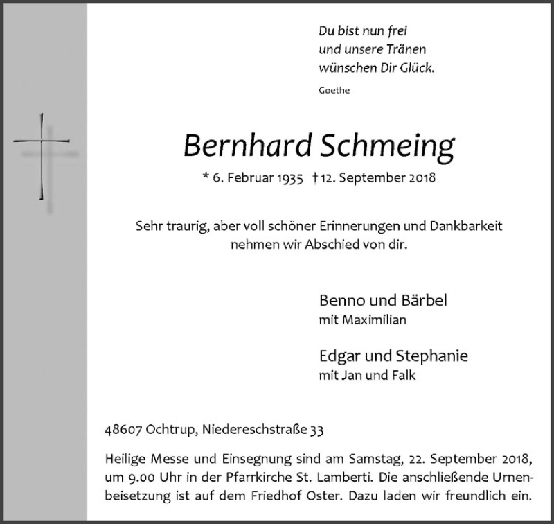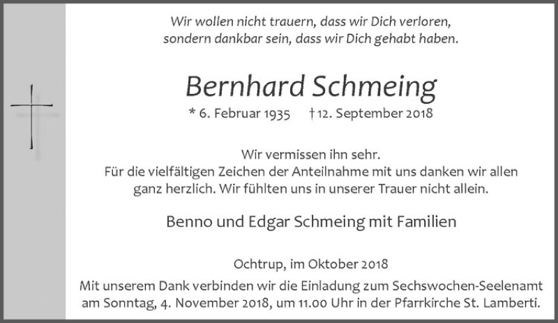 Hier finden Sie alle Traueranzeigen aus der Zeitung, die bisher für Bernhard Schmeing erschienen sind. Weitere Traueranzeigen, die in der Zeitung erscheinen, werden hier ebenfalls aufgelistet