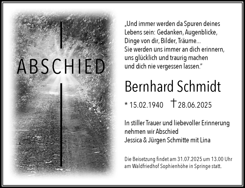 Hier finden Sie alle Traueranzeigen aus der Zeitung, die bisher für Bernhard Schmidt erschienen sind. Weitere Traueranzeigen, die in der Zeitung erscheinen, werden hier ebenfalls aufgelistet