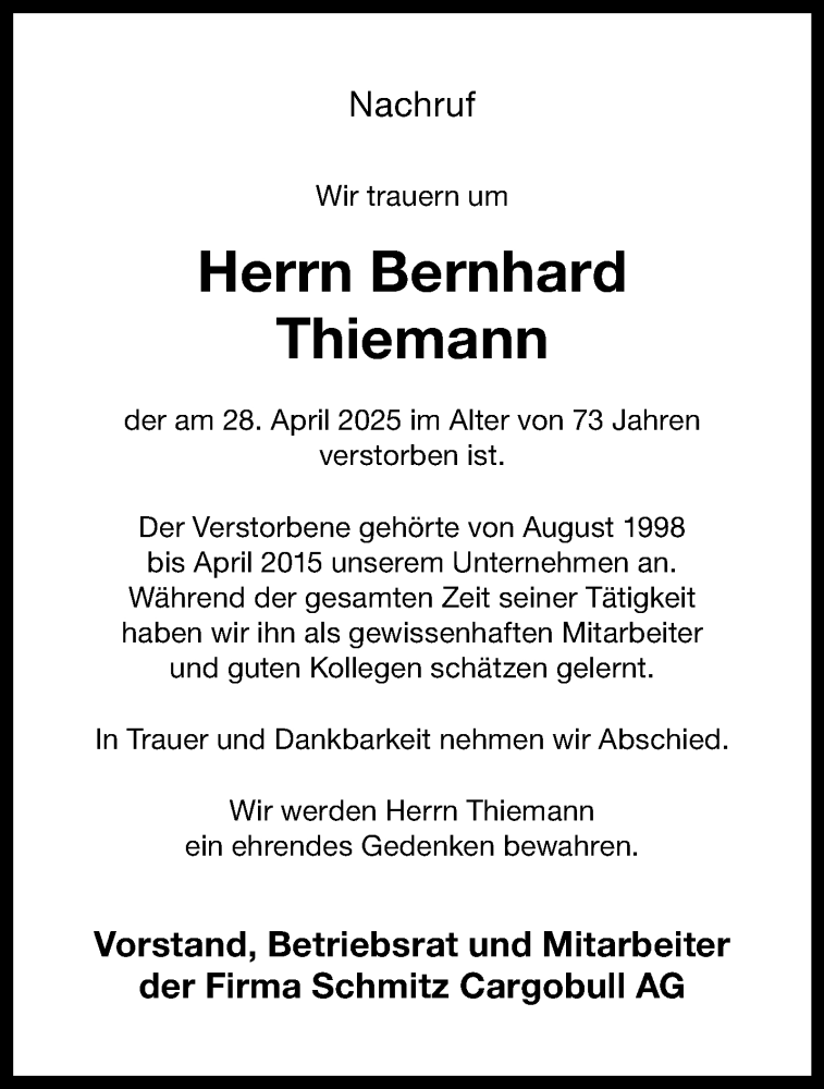 Hier finden Sie alle Traueranzeigen aus der Zeitung, die bisher für Bernhard Thiemann erschienen sind. Weitere Traueranzeigen, die in der Zeitung erscheinen, werden hier ebenfalls aufgelistet