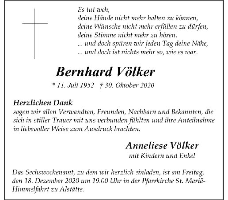 Hier finden Sie alle Traueranzeigen aus der Zeitung, die bisher für Bernhard Völker erschienen sind. Weitere Traueranzeigen, die in der Zeitung erscheinen, werden hier ebenfalls aufgelistet