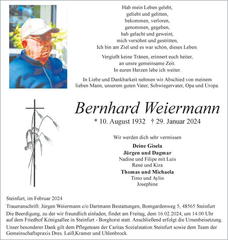 Hier finden Sie alle Traueranzeigen aus der Zeitung, die bisher für Bernhard Weiermann erschienen sind. Weitere Traueranzeigen, die in der Zeitung erscheinen, werden hier ebenfalls aufgelistet